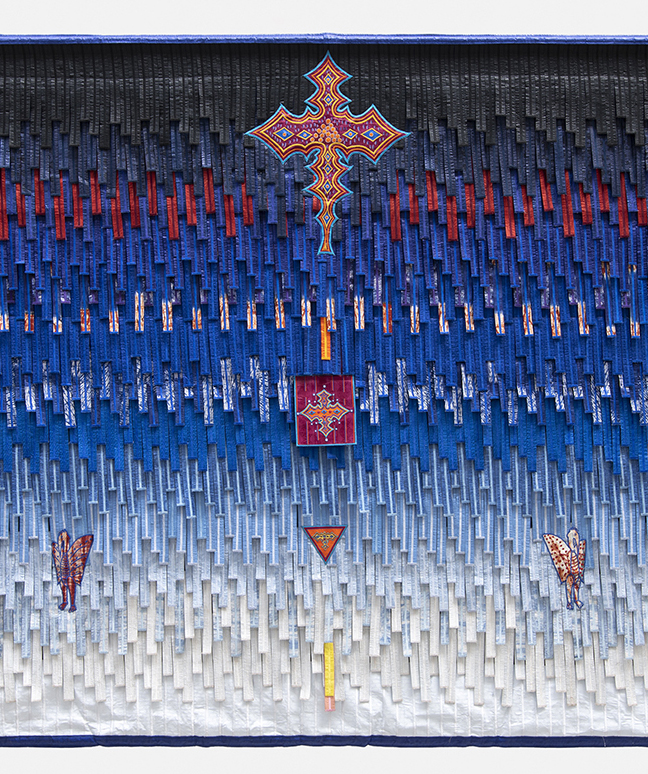 Pour sa première exposition chez Templon, l’artiste malien, figure majeure de la scène contemporaine africaine, dévoile un ensemble inédit de dix œuvres monumentales, entièrement cousues à la main. Conçues à partir de tissus camerounais et de chutes de bazin – étoffe emblématique du vestiaire africain traditionnel – ses compositions se distinguent par l’agencement organique de languettes, teintes, découpées puis cousues, qui créent des surfaces vibrantes et chatoyantes. Fruits d’un long travail de recherche et de documentation, ces œuvres puisent à des traditions multiples : l’artisanat malien ou l’art tibétain, les céramiques tunisiennes ou encore les textiles berbères.
