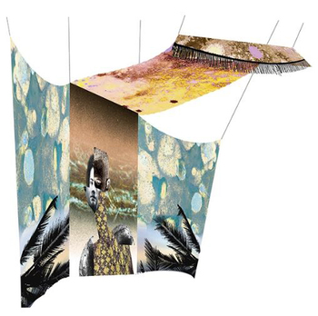 Pensée comme un décor somptuaire entre trône et baldaquin, elle mêle tapisserie, soie imprimée et inserts sérigraphiés dans une esthétique de collage.