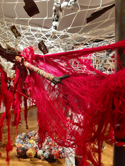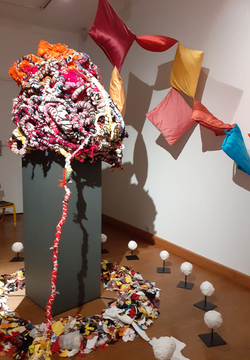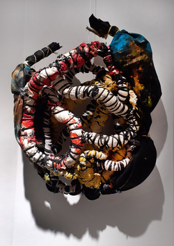 La couleur et la matière textile, provenant de fil et de tissus de récupération, sont foisonnants dans le travail de Hyacinthe Ouattara. Chaque élément apporte une surprise, chaque nœud crée une relation spatiale d’une grande richesse.