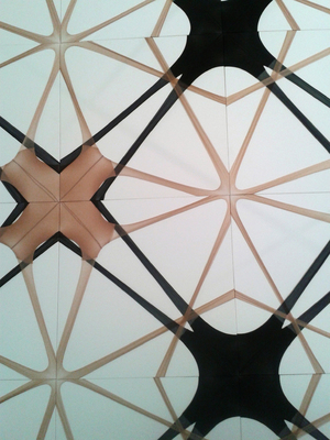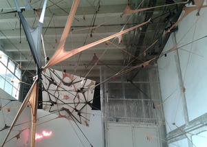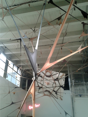A l’aide de collants féminins, Martin Soto Clement tisse une gigantesque toile d’araignée au-dessus de la nouvelle cafétéria du Palais de Tokyo à Paris.