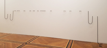 « Mon œuvre Coutures est composée de fer à béton imitant le mouvement d’une corde. Elle vient coudre le mur dont elle sort, formant des boucles de dimensions différentes avant de tomber sur le sol. Ce fer à béton est traité afin d’avoir une couleur noire avec quelques reflets violets. Cette installation est un geste évoquant la construction même d’un lieu, d’une architecture. En sortant de la cimaise, le fer à béton rend visible une forme invisible. Le geste de la couture évoque alors une manière de lier le dessous avec le dessus. Un jeu d’illusion se crée par le contraste entre la rigidité du métal et les formes arrondies et souples d’une corde. » Charlotte Simonnet