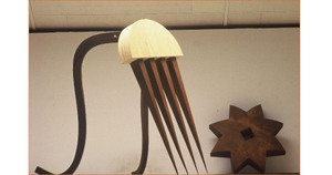 Trois sculptures aux formes essentielles, dont une occupant toute la hauteur de la galerie. Elle rappelle un peigne utilisé pour tasser les fils de trame d’une tapisserie ou encore un peigne à démêler les cheveux crépus.