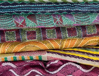 La tradition du Kantha, spécifique du Bengale, fut l’illustration même du Quilt asiatique. La superposition d’étoffes usagées, piquées ensemble, se trouvait maquillé par d’intenses broderies dont le fil était prélevé sur la couture.