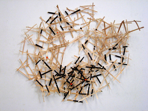 Annick Doideau entrelace des baguettes de bois pour constituer des reliefs picturaux qu’elle suspend aux murs. Dans les salles du centre Nicolas Pomel ses assemblages occupent les cloisons blanches comme les boiseries à moulures pour jouer et déjouer une interprétation du lieu. Chaque emplacement y accueille les mises en tension d’une œuvre spécifique, pensée pour lui, ici et là, entre la remise en doute et la réactivation des expériences de l’artiste. Chaque exposition d’Annick Doideau est l’occasion de mener une réflexion sur le lieu dans lequel elle est invitée à composer, en tissant librement avec les frêles morceau de bois et de cagette qui constituent son support et sa matière.