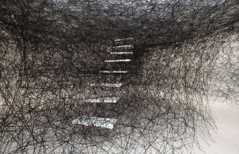 Piranesi was famous for his Carceri dâinvenzione, a series of etchings of fictitious and atmospheric âprisonsâ. The web of black yarn which surrounds the rising steps in Stairway, creates angles and spaces which echo those in Piranesiâs invented architectural fantasies. The prisons exist in the artistsâ imagination and snare dreams and memories.