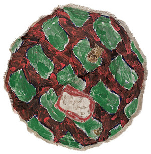 Les années 1980 marquent le temps de la reconnaissance pour Claude Viallat : après les années fondatrices de Supports/Surfaces, l’artiste s’émancipe et développe une œuvre picturale originale qui sera exposée dès 1982 au Centre Pompidou et en 1988 au Pavillon français de la Biennale de Venise. Tout en restant fidèle au programme qu’il avait mis en place dès 1970 — s’affranchir des contraintes de composition et de représentation, désacraliser la toile libérée de son châssis — l’artiste expérimente davantage la couleur et les textures. Il est particulièrement inventif dans le choix de ses supports, tels qu’oriflammes, rideaux, fragments de tente ou de parasols.
