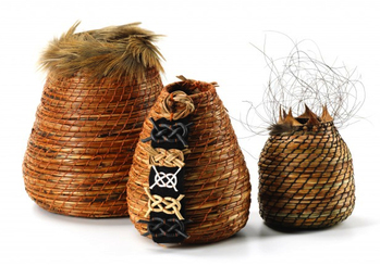 The work in the exhibition comprises tapestry, mixed media montages and assemblages, framed works, baskets and books, the majority of works using materials collected from the gardens with writing and poems often in Scots.
