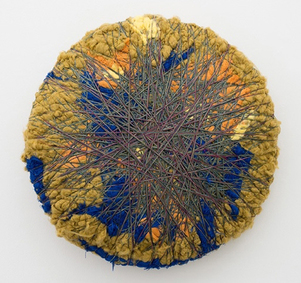 Tandis que la ligne de Fontana décrit la trajectoire des planètes, Sheila Hicks, elle, y ajoute des satellites et les inscrit au mur telle une constellation interplanétaire. Selon l’artiste, le langage des fils est universel et constitue un lien entre les êtres. C’est pourquoi elle étudie, pour la réalisation de ses projets, non seulement les spécificités du lieu, mais aussi les caractéristiques de son public qui devient son principal complice. Elle aime créer de nouvelles couleurs qu’on trouve rarement dans la nature, grâce à un travail subtil sur leur perception et à partir d’associations de teintes, de textures et de matières inattendues.
