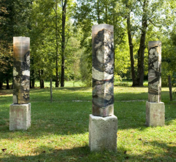 En 1974 Hélène SOUBEYRAN crée des motifs, des supports en textile ou en papier, explore le cheminement de la teinture dans les fibres, jongle avec les colorants. Son parcours l’a conduit ensuite vers une expression minéralogique. Un long travail de plis de textiles et de papiers, enduits de terre et de couleurs, compressés, déformés, deviennent des créations géologiques… Puis, c’est l’aventure extrême : stratifier les créations et les œuvres teintes du passé jusqu’à obtenir une sédimentation d’un bloc unique, qui, scié en 9 piliers, tranches, lames minces et fragments, donnent de nouvelles œuvres singulières dénommées « Du Souffle de la Terre ».