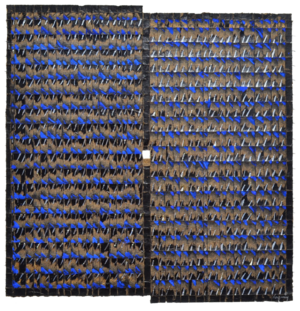 insoupçonnées, les pertinences de réflexion. Dans son désir de révéler l’insoupçonnable, il s’intéresse aux papiers krafts qui protègent les œuvres lors des transports. Feuilles doubles de kraft ou de kraft/aluminium, à l’intérieur bitumé, renforcé de fils de chanvre ou de nylon, ils constituent un formidable terrain d’exploration. Ces papiers, qui constituent l’essentiel de l’exposition à la Galerie Lazarew, sont diversement déchirés, dédoublés, évidés puis peints avec des techniques personnelles, issues de ses rencontres avec les matières les plus insolites. A eux s’ajoutent la récente série Fusions Carbones.