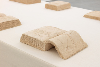 Invito a Tavola, qui marque la première exposition personnelle de Maria Lai (1919-2013) aux États-Unis depuis 1956, se compose d’une grande table d’environ neuf pieds de long et trois pieds de large, sertie de pains et de livres en terre cuite. Le travail, créé en 2004, exprime la profonde conviction de Lai que l’art fournit une nourriture essentielle à l’âme, et suggère en même temps l’importance de rompre le pain comme un moyen de lier les communautés et de guérir la discorde. L’installation souligne également l’expérimentation, le jeu et la maîtrise des matériaux de Lai, que l’on peut percevoir dans son travail sur les textiles. Invito a Tavola est l’une des deux seules installations de ce type produites par l’artiste, la seconde étant exposée dans le lieu de naissance de Lai, Ulassai, à la Stazione Dell’Arte, un musée dédié à l’œuvre de Lai.