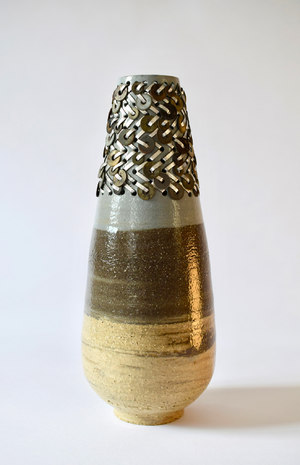 Nous nous intéresserons particulièrement aux pièces de Silver Sentimenti, qui brode le grès. Après une carrière dans le monde de la mode, il a renoué avec la céramique qu’il a apprise à Faenza en Italie. À la croisée de deux mondes, il réinvente les liens qui unissent l’argile et le textile. Gladiateurs, canuts, des œuvres inspirées par l’antiquité, l’architecture Bauhaus ou bien encore par l’art premier ou les arts du tissage.