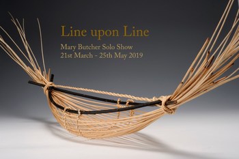 For this exhibition Butcher has produced a collection of both sculptural objects and functional baskets, made in response to her handling and selecting of the harvested materials. She enjoys making large installations for walls or hedges such as her basketry ‘drawings’, but the detail in small objects also preoccupies her mind.