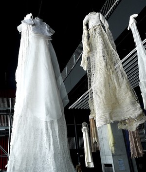 D’origine australienne, Diana Brennan, diplômée de l’école des Beaux-Arts de Sydney, vit et travaille en France. Fascinée par les effets de la lumière sur les structures textiles, elle mélange les matériaux nouveaux. Elle est aussi à l’aise avec les grands formats de ses « robes de lune » présentés au quai des Arts, qu’avec de petites œuvres, présentées à la Maison des Dentelles, accompagnées de trois grandes encres. Autant de regards portés sur les détails de ses fils entremêlés que Diana Brennan manie avec une subtile dextérité.