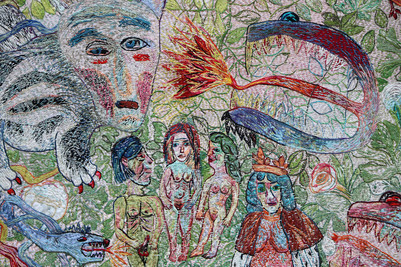 Anna Torma’s large embroideries are complex expressions of her experiences of family, immigration, joy, and the act of creation. Her works are richly layered narratives with references to popular culture, thrift shop aesthetics, and traditional Hungarian textiles.