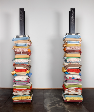 Her use of textiles is a central tenet of her work. Whether a shirt or a blanket, these are items that protect us against cold and external dangers. In Companion Species (Guardian/Auntie) she uses reclaimed army blankets, which are used to camouflage and conceal their human counterparts in nature. These earthen green blankets embody landscapes while holding, protecting, and shielding and underline the reinforcing link between the object and the narrative. For over 15 years Watt has been creating hand sewn tapestries, often realized through collaboration with sewing circles around North America. For Watt the use of secondhand blankets is essential; they come imbued with life, embedded with their own history and stories.