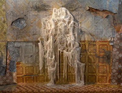 Travaillant la performance, le tissage, la sculpture et l’installation, l’artiste sud-africain Igshaan Adams explore la matérialité, la phénoménologie et l’identité. Pour sa première exposition personnelle dans un musée aux États-Unis, Adams tapisse les murs et les sols de la vaste galerie Pamela Elaine Poetter avec des sols en linoléum usagés extraits de maisons ouvrières du Cap, en Afrique du Sud. Dans cette installation se trouve un amalgame d’œuvres créées à partir de tissages sculpturaux ainsi que des tentures murales.