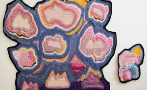 The latest chapter of this adventure is the creation of narratives in a space where distinctions between craft, design, high art and low culture are blurred. Clewer and de Lussy take it in turns to play with crochet and knit, using luxurious blends of mohair, wool and super-synthetics. Each blanket is individually created by the duo, taking on its own personality as it grows organically and fluidly. The process is more akin to collage or patchwork than meticulously planned design. Each blanket tells its own story, mixing in patterns, shapes and characters.