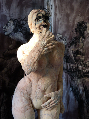 Avec de la ouate et du tissu, l’artiste modèle ses sculptures. Comme une Parque, à force de points, de nœuds, de brides, de reprises, elle fait apparaître un corps, pas un corps en gloire, mais un corps commun à tous avec ses défauts et ses petites imperfections. Le choix de l’échelle à taille humaine confère aux sculptures un effet de miroir renvoyant le spectateur à lui-même.