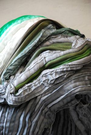 Œuvres textiles réalisées à partir de sangles, tissus, fibres récoltés auprès des entreprises de la région, l’artiste revisite la perception du territoire annécien entre paysage et rencontre humaine.