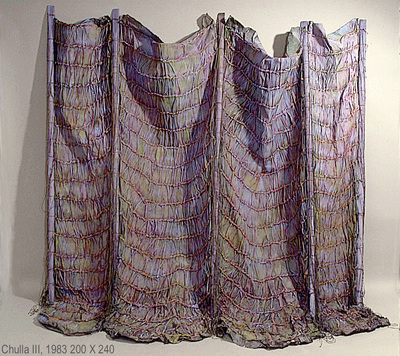 « La série monumentale, « Chalunga », (1982) est composée de hautes formes dans l’espace. Énigmatiques, mystérieuses, ni humaines, ni animales, par leur puissance elles dominent l’espace dans lequel elles sont confinées. » Extrait du livre Whole Cloth de Mildred Constantine et Laurel Reuter (1997, Monacelli Press, N.Y.)