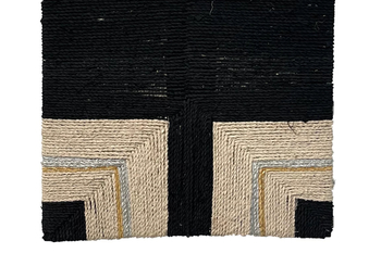 Litanie des horizons obscures émerge de la convergence entre un savoir-faire ancestral et une technique de tissage apparue dans les contrées rurales du Maroc dans les années 1960, consistant à créer des tapis à partir de textiles usagés. Habituellement nouées, les étoffes recyclées se trouvent ici torsadées puis agencées en une série de panneaux aux dimensions strictement identiques, comme un hommage à la répétition d’un geste séculaire.