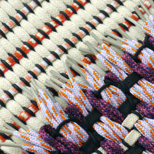 « Nous avons axé notre recherche sur le recyclage de chutes de production en partenariat avec la Société Choletaise de Fabrication qui fabrique des rubans, tresses, cordons et lacets sur-mesure. Après avoir identifié les chutes de l’entreprise, nous avons mené un travail expérimental de tissage dans notre atelier en croisant les matières et les couleurs. Nous présentons le résultat de ces recherches tissées à la main sous forme d’échantillons et de prototypes. »