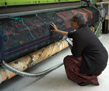 L'exposition présente une nouvelle commande à l'artiste: un environnement global de tapisserie, de sculpture, de son et de texte qui explore les rythmes turbulents de la nature et de la société. Créée spécifiquement pour l'Atrium Marron Family du MoMA, l'installation est centrée sur une tapisserie monumentale à vitrages multiples qui suggère des écosystèmes et des galaxies tentaculaires. La tapisserie présente une gamme kaléidoscopique de fibres naturelles et synthétiques créée par l'artiste utilisant des techniques innovantes de tissage numérique au TextielLab de Tilburg, aux Pays-Bas. Sculptures composées de cordes teintes, entrelacées avec des formes en verre soufflé à la main et en céramique, pendues à côté de tablettes en céramique portant l'inscription des poèmes de l'artiste, ces divers éléments sont réunis dans le cadre d'un travail sonore immersif basé sur la voix et le respiration de l'artiste.