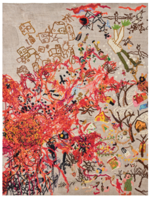Pour sa première exposition à Paris, le musée présente six de ses broderies les plus importantes au sein du parcours des collections. Dans Llanto por la Monja Gitana (Lamentation pour la nonne gitane), l’artiste a brodé une longue procession d’exilés sur une toile de plus de trois mètres, où il évoque notamment l’expulsion des juifs d’Espagne en y intégrant des figures de son panthéon personnel comme Federico García Lorca ou Marceline Loridan-Ivens. Les origines marranes de Pascal Monteil ne sont sans doute pas étrangères au choix de cette fresque épique.