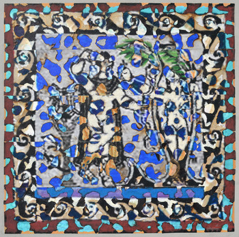 Ici, dans ce travail récent (2019-2022) l’artiste prend pour base les versions numérisées de tissus coptes ou de tapisseries célèbres (La Dame à la Licorne, l’Apocalypse). Largement étirés, les pixels des détails ainsi imprimés rappellent ceux des points de tapisserie ; coupée en bande, tissée, tassée, brûlée, peinte, l’image retrouve une texture qui appelle une nouvelle lecture.