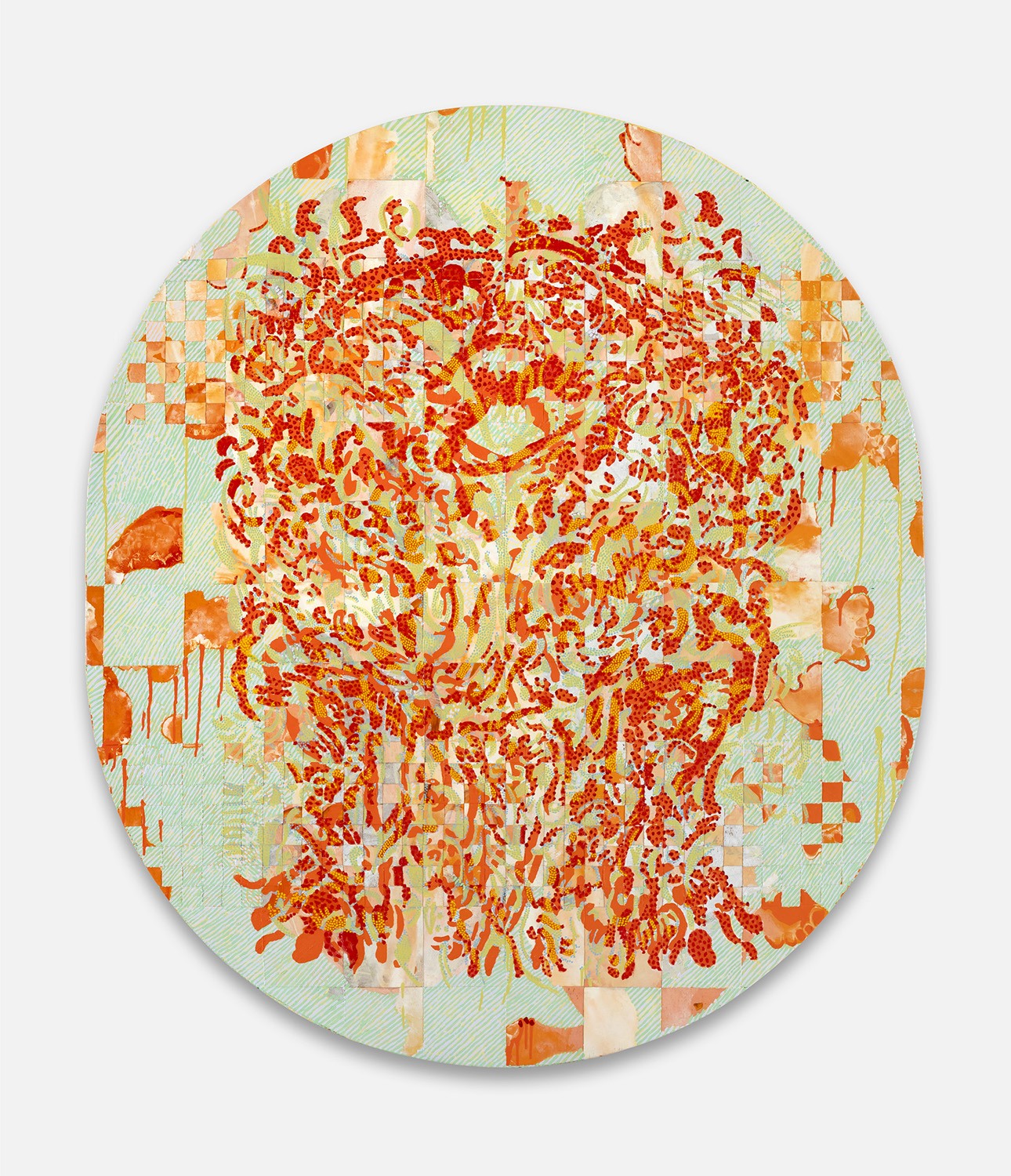 L’exposition rassemble principalement des toiles, près d’une vingtaine de pièces, issues des séries Transis et Recordas. Dans les premières, exécutées à la cire, des formes surgissent au coeur de motifs réitérés, telles des traces mémorielles qui transforment chaque oeuvre en apparition, en suaire indélébile. Dans les secondes, Rouan tresse avec minutie des fragments de toile, donnant naissance à une trame à la fois littérale et symbolique. Les couleurs s’y entrecroisent avec intensité, les formes s’y répètent obstinément, malgré la désagrégation opiniâtre de la surface. Rien ne s’offre d’emblée au regard : l’oeuvre requiert une approche patiente, toujours recommencée. Par ce jeu d’emprunts et d’empreintes, François Rouan compose une oeuvre éminemment palimpseste, qui se présente comme un « travail magnifique sur la texture de l’existence » (Daniel Sibony).