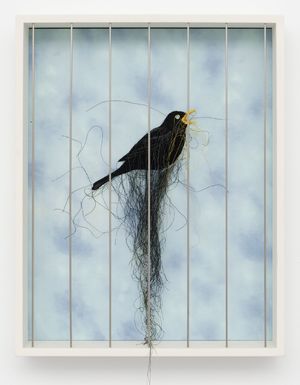 J’ai pris autant de soin que possible à maîtriser les fils avec lesquels les oiseaux ont été brodés et incrustés sur de petits morceaux de tissu – des fragments de vieilles taies d’oreiller ou de pyjamas. En revanche, j’ai laissé les fils de coton s’échapper, comme pour donner vie, mouvement, voix, potentiel et liberté à certains d’entre eux qui s’égarent entre les barreaux. Une fois installés dans leur monde en boîte, j’ai eu l’impression que ces fils imprévisibles devenaient des nids d’oiseaux, qui s’enroulaient et s’emmêlaient de leur propre chef. »
