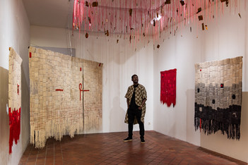 Le projet qu’Ange Dakouo a imaginé pour sa seconde exposition personnelle à Paris s’est déroulée à la Fondation H en septembre 2023 à l’issue d’une résidence à la Cité internationale des arts. Il est fait de tapisseries murales composées de gris-gris composés de papier journal et de fil.