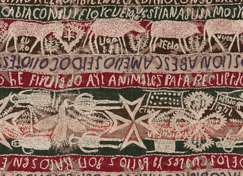 Première rétrospective de l'artiste Policarpio Valencia (né en 1853 – décédé en 1931) dont les textiles brodés envisagent les sujets sérieux de la moralité et de la mortalité avec esprit et fantaisie.