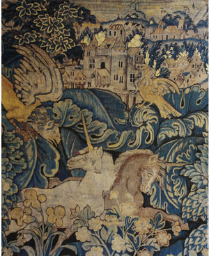 Si nous insistons sur ces choix pour un espace qui, venant d’ouvrir, devrait avoir mis en place des moyens d’une grande efficacité, c’est que le hasard de nos visites en ce début de juillet nous a menés au château de la Trémolière, où se trouvent les dix remarquables tapisseries de la tenture d’Anglards-de-Salers, tissée au 16e siècle et classée Monument historique. Dans ce petit château, doté de peu de moyens, la visite est un plaisir tout simplement parce que pour remplacer cartels et panneaux explicatifs un audio-guide est proposé à l’entrée. Il permet non seulement de connaître l’histoire de la tenture et de repérer, dans le foisonnement de la représentation, les éléments remarquables, mais aussi de découvrir la technique utilisée. Dès le XVIe siècle, Aubusson est célèbre pour ses « verdures », des paysages où évoluent des personnages dans une végétation abondante, parfois ornée d’une frise de feuilles de chou. La tenture d’Anglards-de-Salers en est un exceptionnel exemple, mais, au lieu de contenir des personnages, elle représente, sur un fond de feuillage et de « feuilles de choux », des châteaux, des villes et surtout des animaux réels et imaginaires (comme évidemment des licornes et des dragons), locaux et exotiques (comme des lions).
