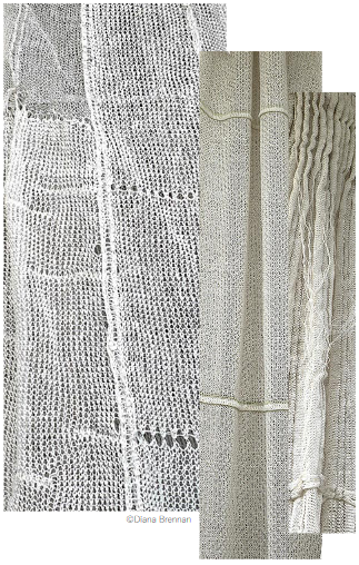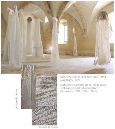 La dimension reliquaire et sacrée du travail de l’artiste est rendue évidente dans « Robes de lune ». Pour ce projet, Diana Brennan tricote de longues traînes, jupons et emmanchures à partir de fibres de lin qu’elle mêle à des fils métalliques. Ces derniers permettent une mémoire de forme. Elle associe ses tricots à des pulls de laine, objets trouvés qu’elle fait intentionnellement rétrécir par feutrage. Elle tente ainsi de rigidifier la matière molle. Ces derniers sont porteurs et vecteurs d’une histoire dont on ignore tout. Ils ont été seconde peau pour quelqu’un quelque part. Ils ont traversé le temps et en portent les marques ; l’usure. Non seulement l’artiste les fait rétrécir mais elle les découpe, les coud et les troue parfois aussi. Diana Brennan opère un détournement de la matière en en exploitant les possibles. Par assemblages, modifications et rajouts elle écrit pour elle une histoire nouvelle. Les mailles de laine resserrées de ces pulls laissent peu passer les rayons lumineux. Le travail de tricot est quant à lui translucide. D’aspect aérien et d’une finesse remarquable, fibres naturelles et métalliques s’équilibrent dans ses créations.