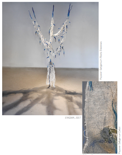 Pour les racines créées, Diana Brennan adopte résolument une démarche sculpturale. Alors que le tricot circulaire offre peu de possibilité de manipulation, le tricot à plat permet des effets de surface. Elle tricote alors les racines principales à plat avant de les coudre ensemble et de les modeler tandis qu’elle confectionne les radicelles en utilisant le tricot tubulaire.