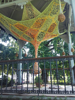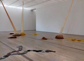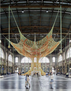 Alors qu’ Ernesto Neto a installé une sculpture monumentale de 20 m de haut dans la gare de Zurich, deux autres installations sont visibles à la fondation Beyeler, dont une en bas nylon emplis d’épices.