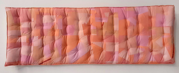 Matelas de Plage, œuvre de 2022 confectionnée en draps d’hôpitaux réformés formant un patchwork qui joue sur les nuances de pastel. Ce patchwork qui recouvre le matelas devient une surface de mémoire.