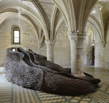 À l’Abbaye, l’osier noué ou tressé répond aux formes gothiques. Dans le parloir, les tiges de saule prolifèrent en boucles aériennes et s’élancent jusqu’à envelopper le spectateur. Dans la salle des religieuses, une sculpture haute et dense prend racine dans le sol et s’y étire comme un être vivant. Si les œuvres ont la puissance de la nature, elles donnent aussi corps à la présence passée des sœurs : ici, les propos qui s’entrecroisent sans fin, là, la minutie et la concentration des travaux d’aiguille évoqués par l’osier finement tressé.