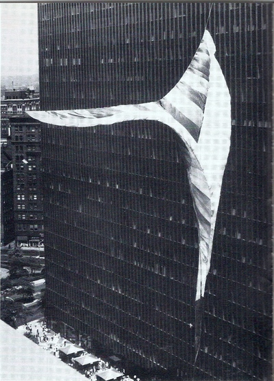 Ce que l’on connaît du travail de Cindy Snodgrass, dans les années 70-80 ce sont ces immenses bannières de tissu qui flottent au dessus des buildings de Pittsburgh (1974) ou qui s’échappent, telles des flammes, des fenêtres d’un bâtiment, dans l’Ohio (1984). Les installations qu’elle met en place entre les immeubles de grandes villes américaines sont toujours en relation avec des lieux spécifiques.
