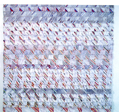 Les longues marches de Claude Lagoutte sont à l’origine d’une toile, libre de châssis, imprégnée des pigments et terres recueillis sur son chemin. Le parcours du marcheur rythme le rouleau déployé, selon des bandes de toiles découpées, froissées, pliées et teintées puis cousues horizontalement à la machine.