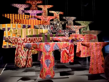 Nombre de productions splendides et monumentales mêlant couleurs et or – chapans, robes, coiffes, tapis de selle – réservées à la cour et aux cadeaux diplomatiques sont exclusivement confectionnées à l’atelier privé de l’émir. Bien d’autres pièces sont à découvrir au fil de l’exposition, dont les fameux ikats et leur florilège de couleurs, spécificités stylistiques régionales du Khorezm, de la vallée du Ferghana ou de la région du Karakalpak, où des accumulations de bijoux prolongeaient le vestiaire féminin.