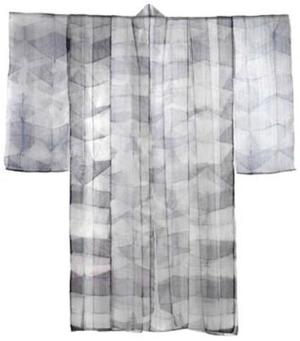 – Kiri shigure est inspirée par un haïku du poète Bashô : « Le jour où le mont Fuji est invisible par la brume de pluie est aussi savoureux ». Marie-Hélène Guelton a utilisé une technique de teinture à réserve dérivée du shibori, sur de la soie et de la fibre d’ananas.
