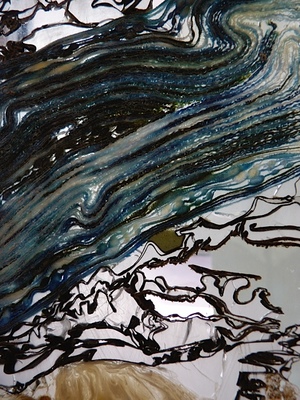 « Du Souffle de la Terre » est le titre que j’ai donné à ma démarche artistique liée au temps, à la transformation, à la vie et à la mort, explique l’artiste. Inspirée par les coupes de pierre, les prélèvements de sol, les plissements géologiques, j’ai stratifié 25 ans de mes créations de textiles et papiers plissés et teints. Le bloc stratigraphique ainsi formé a été scié en marbrerie sous forme de plaques, de piliers et de lames minces. Ces coupes longitudinales, debout ou en suspension, évoquent la force et la fragilité de la vie. Les créations chaotiques du passé, figées puis sciées libèrent le présent et donne naissance à un nouveau souffle.”
