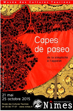 Sous le titre Capes de paseo, de la simplicité à l’apparat, l’exposition met en valeur un des éléments textiles fastueux qui accompagne le costume du torero, la cape de paseo. Le capote de lujo ou capote de paseo est en effet un des éléments incontournables du trousseau taurin, lié à son histoire et à son évolution, que ce soit dans sa forme la plus modeste, un manteau d’une grande simplicité battant les mollets du torero, ou sous celle d’un objet d’apparat et de luxe, drapé sur l’épaule gauche du maestro et porté lors du paseo d’ouverture de la corrida.