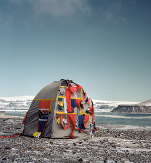 Antarctic Village – Dome Dwelling de Lucy + Jorge Orta, installée sur le continent de l’Antarctique en 2007, soulève des questions autour des problèmes reliés à l’environnement, la politique, l’autonomie, l’habitat, la mobilité et les relations entre les personnes. Chaque tente-habitation, fabriquée à la main avec des drapeaux de différents pays du monde, ainsi que des vêtements et des gants, est sérigraphiée avec un nouvel article issu de la Déclaration des droits de l’homme (13.3). Depuis l’éveil d’une crise migratoire sans précèdent et la hausse du déplacement des communautés du au réchauffement climatique, le projet Antarctica est un puissant rappel afin de redéfinir la notion de bien commun.
