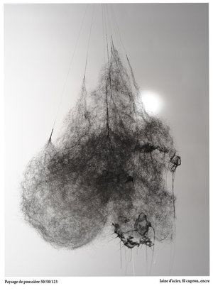 L’aspect aérien de ce travail arachnéen est obtenu à partir de laine d’acier, de fils de cupron (cuivre combiné à des fibres textiles) et d’encre.