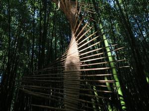 Mireille Laborie – Ainsi Soie Fil. Pour cette nouvelle réalisation, Mireille Laborie utilise à nouveau la ligne. Cette installation de fils blancs s’accrochera en divers points sur les supports bambous pour dessiner dans l’espace une immense toile, mi- dentelle, mi- tissage. L’artiste fascinée par l’élaboration de la toile d’araignée constituée de si peu de matière et de tant de vide, imagine une toile qui fait allusion au Web. Vécu comme un symbole de liberté, de rapidité, de partage, le côté positif de cette immense toile, peut aussi, si l’on n’y prend garde se révéler être le plus dangereux des pièges. On retrouve dans les volumes de bois tressé qui évoquent le mot « chrysalide », l’enveloppe vide abandonnée par l’insecte sur le chemin, la forme d’une vie enfuie pour se reproduire, ailleurs, dans le cycle infiniment recommencé de la vie.