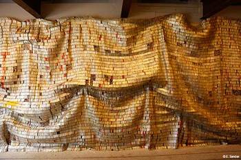 Pour l’œuvre de Chaumont, plus de 2 millions de capsules métalliques de bouteilles de Brandy ont été reliées, cousues à la main au fil de cuivre, à la façon d’un filet de pêcheur, offrant une saisissante sensation de légèreté. « On oublierait presque que cette pièce colossale, réalisée à partir de 2,3 millions de bouteilles, pèse une tonne », s’enthousiasment les étudiantes qui ont participé à sa réalisation.